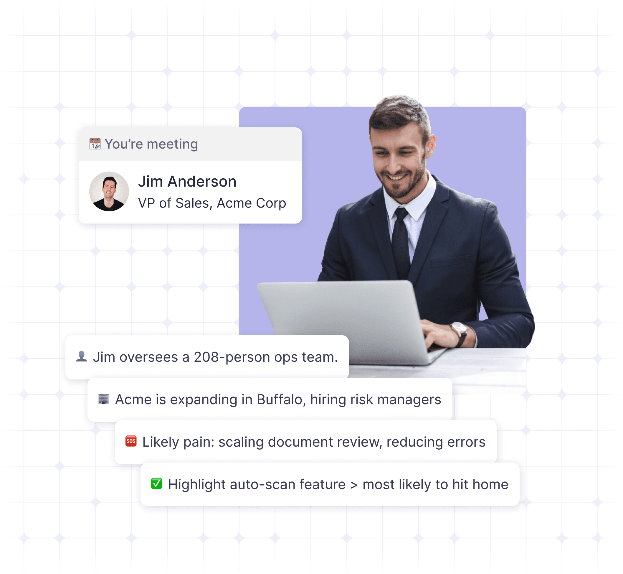 20-30+ mins of tab-hopping across LinkedIn, company sites, CRM just to sound relevant. And likely still miss key signals.